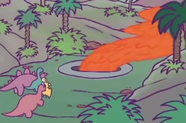 Harold invites the pteranodon on his hunt to find the brachiosaurus. They stumble down the mountain the nest is on, making the pteranodon and Harold as well, thirsty. The pteranodon dips his head into the pond in front of them but it is dark brown and sticky, and it briefly makes his mouth stuck together. Harold draws a dipper and sees what is wrong with the pond water, and finds out that the pond water isn't water - it is a tar pit. Nevertheless, Harold draws a pitcher of lemonade and pours him and his new pal a glass. Suddenly the place begins to shake, and a volcano erupts. Harold, along with a team of various dinosaur species plus the pteranodon, run off quickly. Harold doodles a big drain for the lava to go in, which works for a brief moment until it just fills up. Everybody tries escaping the flowing lava with the help of each other. Eventually, they reach a dead end and the lava is still coming towards them. Harold draws a fire hydrant and hose and sprays the lava, cooling it off and changing it to rock. But that's not it, and more lava comes spewing out. Harold draws a brick wall which keeps them safe for the moment, and then draws a cork onto the volcano, which finally stops the lava. The pteranodon was so thrilled, that he began flying, at least for a little bit.